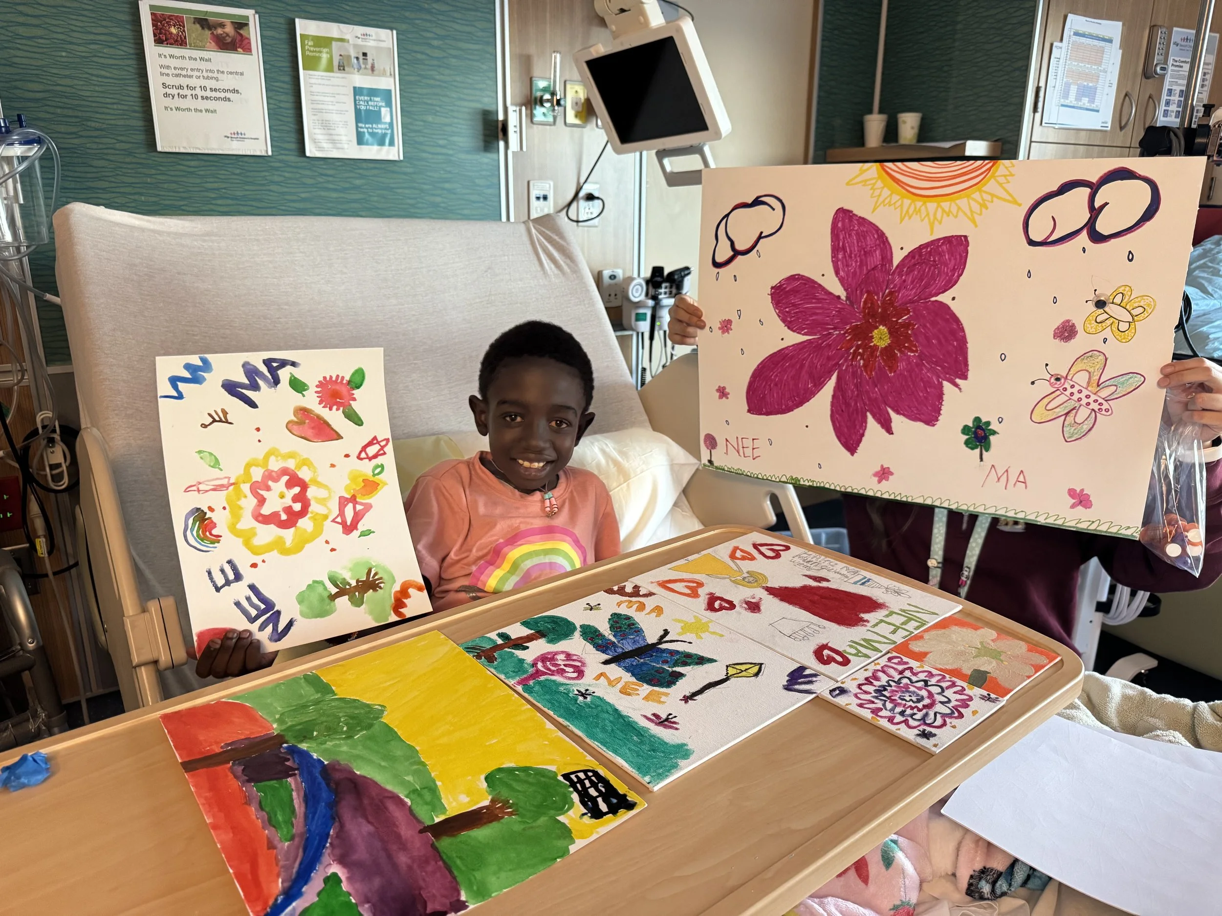 Neema proudly showing off her artwork she created throughout her stay at the hospital.